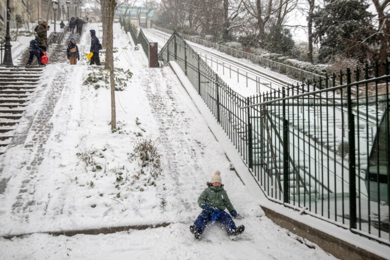 Ένα αγόρι κατεβαίνει με έλκηθρο τα σκαλιά του λόφου της Μονμάρτης κατά τη διάρκεια χιονόπτωσης στο Παρίσι, 7 Ιανουαρίου 2026. EPA/CHRISTOPHE PETIT TESSON
