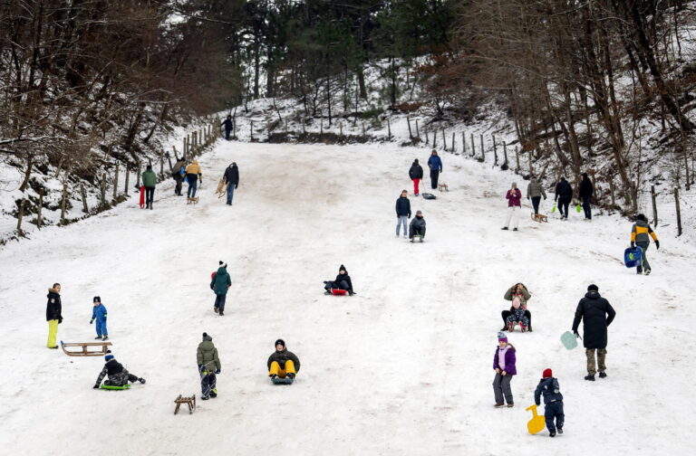Άνθρωποι παίζουν με τα έλκηθρα στο χιόνι στον αμμώδη λόφο του Schoorl, στην Ολλανδία, στις 7 Ιανουαρίου 2026. EPA/KOEN VAN WEEL