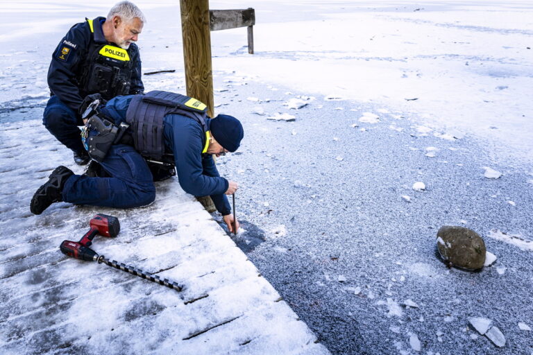 Αστυνομικοί της ακτοφυλακής μετρούν το πάχος του πάγου στη λίμνη Katzensee στην περιοχή της Ζυρίχης, 7 Ιανουαρίου 2026. EPA/MICHAEL BUHOLZER