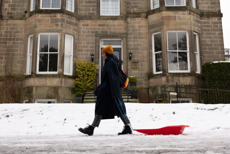 Γυναίκα σέρνει ένα έλκηθρο σε χιονισμένο δρόμο στο Μπάξτον της Βρετανίας, στις 9 Ιανουαρίου 2026. EPA/ADAM VAUGHAN