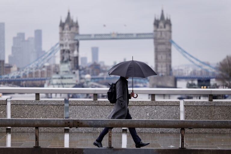 Ένα άτομο με ομπρέλα διασχίζει τη Λόντον Μπριτζ, με τη Τάουερ Μπριτζ να δεσπόζει χιονισμένη στο βάθος, Λονδίνο, 9 Ιανουαρίου 2026. EPA/TOLGA AKMEN