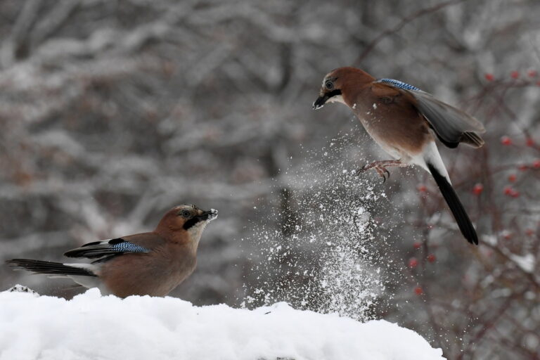 Δύο κίσσες παίζουν μεταξύ τους σε ένα χιονισμένο δάσος κοντά στο Csobanka, στη βόρεια Ουγγαρία, 6 Ιανουαρίου 2026. EPA/ATTILA KOVACS