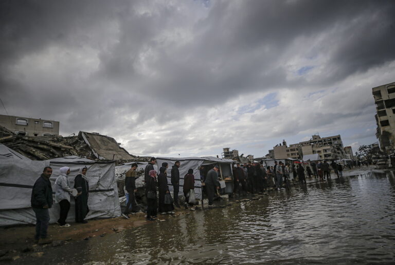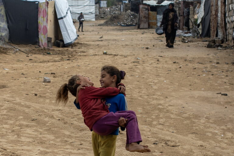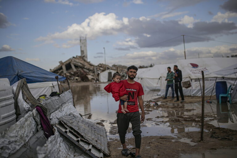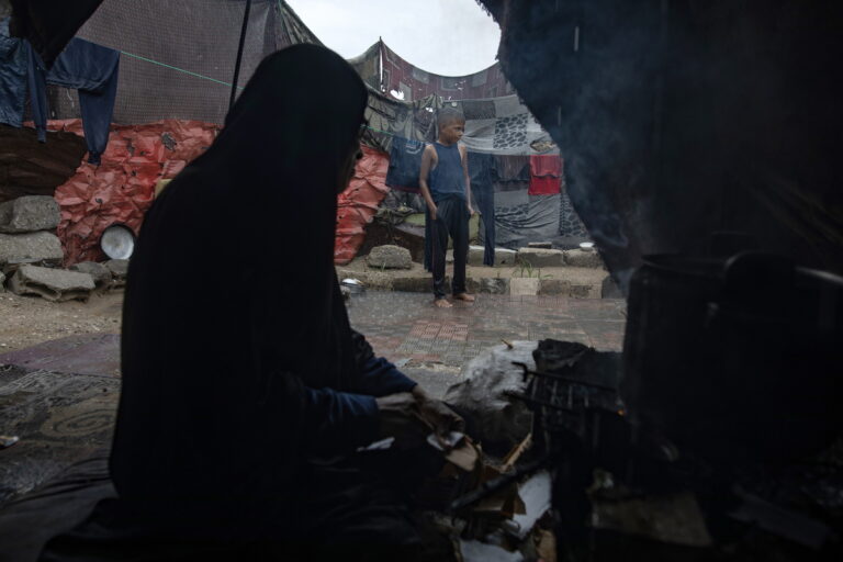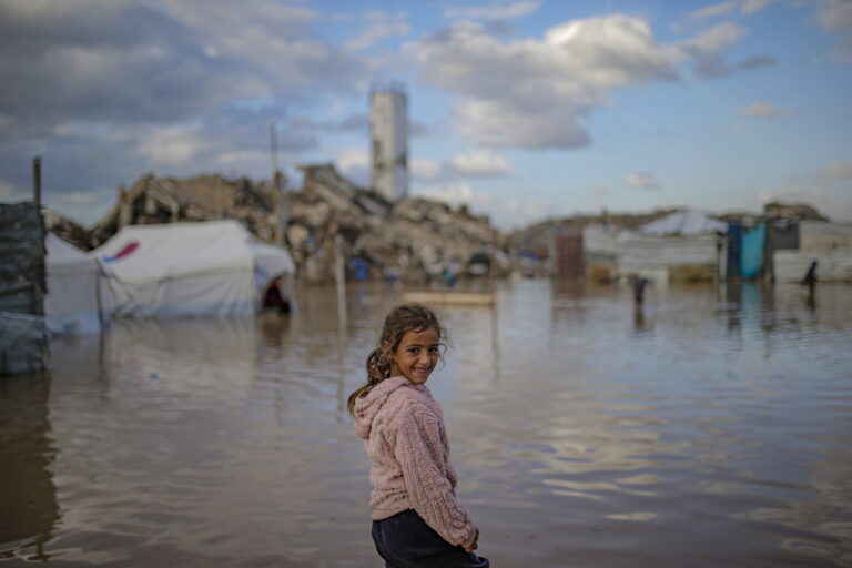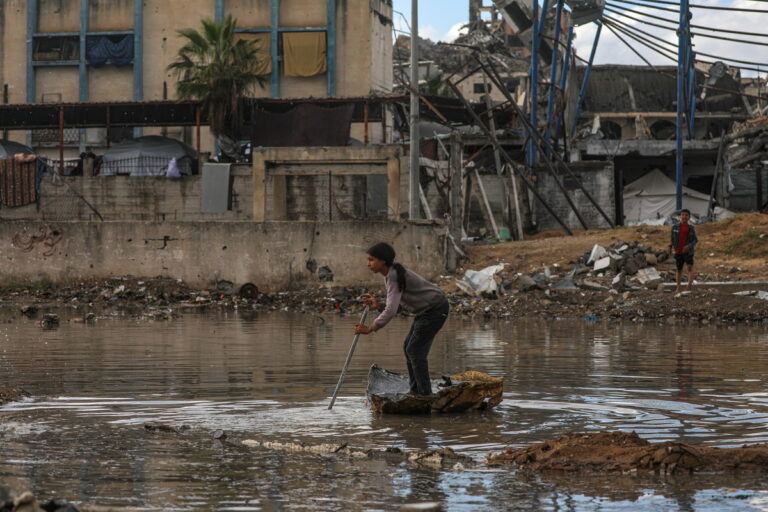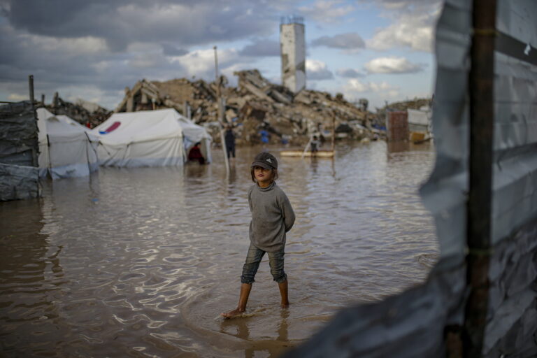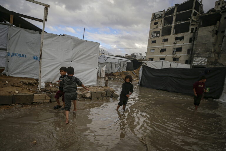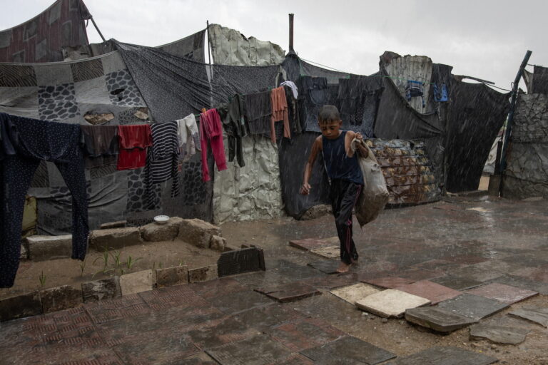 Σήμερα, στη γειτονιά Αλ Ζαϊτούν, ανατολικά της πόλης της Γάζας, η βροχή που έπεσε δυνατή βούλιαξε στη λάσπη τα αντίσκηνα-κατοικίες των εκτοπισμένων ανθρώπων, ενώ μεγάλοι λάκκοι με νερό έχουν κάνει απροσπέλαστους τους δρόμους. Τα παιδιά, μόνο, βρίσκουν μια πρόσκαιρη ευκαιρία για παιχνίδι, αν και τα πρόσωπά τους δείχνουν κουρασμένα κι άγρυπνα.