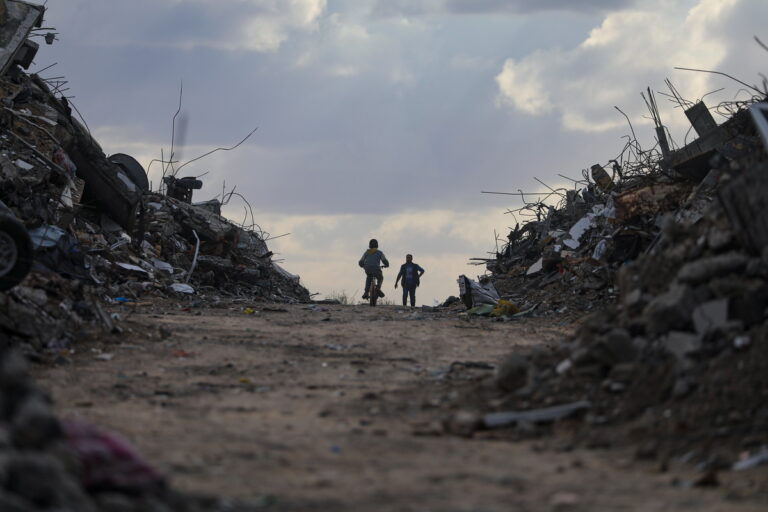 Ένας μικρός Παλαιστίνιος ποδηλατεί ανάμεσα σε ερείπια σπιτιών στη διάρκεια μιας βροχερής μέρας στη συνοικία Αλ Ζαϊτούν, στα ανατολικά της πόλης της Γάζας, στη Λωρίδα της Γάζας, στις 25 Νοεμβρίου 2025. EPA/MOHAMMED SABER