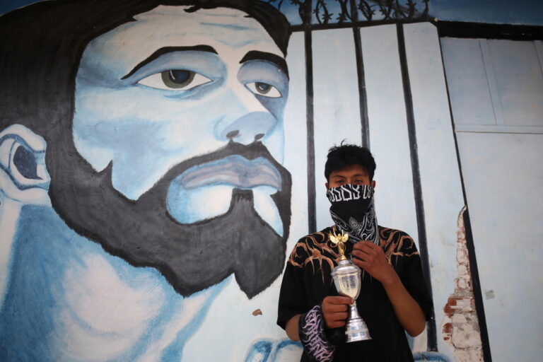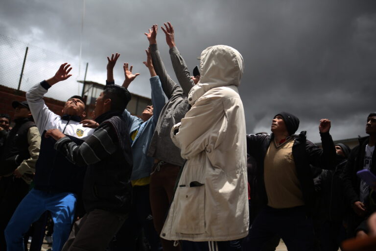Comunidad, στα ελλληνικά κοινότητα, λέει το γκράφιτι στον τοίχο του Κέντρου Κοινωνικής Επανένταξης Νέων Qalauma, ενώ οι ανήλικοι κρατούμενοι συμμετέχουν στο φεστιβάλ freestyle rap. Βιάτσα, Βολιβία, 20 Ιανουαρίου 2026.