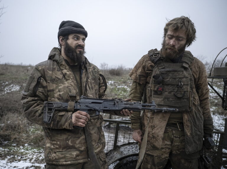 Οι στρατιώτες της 93ης Μηχανοκίνητης Ταξιαρχίας, ο Denis, με κωδικό «Bars», και ο Dmytro, με κωδικό «K2», δείχνουν ένα ρωσικό όπλο που απόκτησαν ως τρόπαιο, μετά την επιστροφή τους από θέσεις που πολέμησαν για 130 συνεχόμενες ημέρες, στην περιοχή του Ντονέτσκ, Ουκρανία, στις 16 Δεκεμβρίου 2025. EPA/Υπηρεσία Τύπου της 93ης Μεμονωμένης Μηχανοκίνητης Ταξιαρχίας Kholodnyi Yar των Ουκρανικών Ένοπλων Δυνάμεων