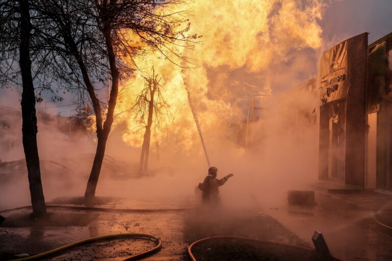 Πυροσβέστες προσπαθούν να σβήσουν μια φωτιά κοντά σε ένα κατάστημα αυτοκινήτων μετά από πυραυλική επίθεση στο Κίεβο της Ουκρανίας, στις 2 Ιανουαρίου 2024. EPA/OLEG PETRASYUK