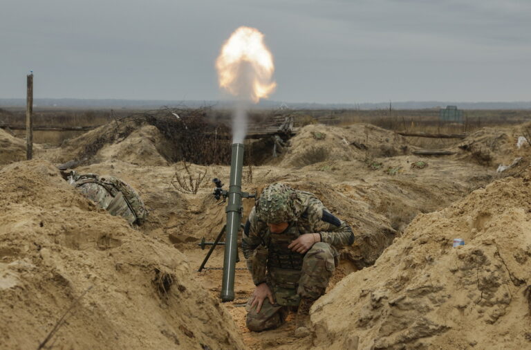 Ουκρανοί στρατιώτες από την ταξιαρχία εφόδου «Bureviy» (Τυφώνας), πυροβολούν με όλμους κατά τη διάρκεια στρατιωτικής εκπαίδευσης, πριν από την αποστολή τους στο μέτωπο, σε ένα πεδίο βολής βόρεια του Κιέβου, Ουκρανία, 8 Νοεμβρίου 2023. EPA/SERGEY DOLZHENKO