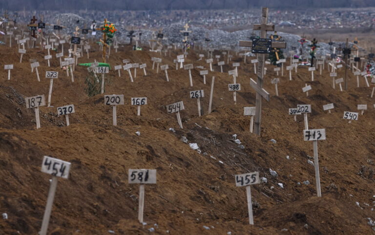 Αναγνωριστικοί αριθμοί σηματοδοτούν τους τάφους των αγνώστων κατοίκων της περιοχής που σκοτώθηκαν κατά τη διάρκεια των μαχών, σε ένα νεκροταφείο στο Μαριούπολη της Ουκρανίας, στις 10 Δεκεμβρίου 2022. EPA/SERGEI ILNITSKY