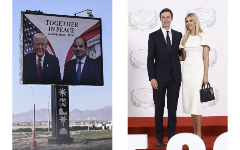 (δεξιά) Η Ιβάνκα Τραμπ, κόρη του προέδρου των ΗΠΑ Τραμπ, και ο σύζυγός της, Τζάρετ Κούσνερ, ποζάρουν, στη Σύνοδο Κορυφής για την Ειρήνη στη Γάζα στο Σαρμ Ελ Σέιχ της Αιγύπτου, στις 13 Οκτωβρίου 2025.