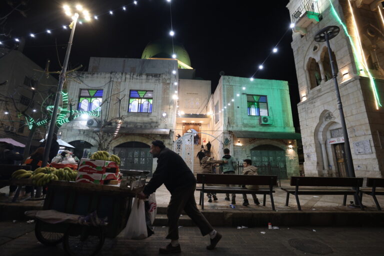 Φωτισμένη πλατεία στην πόλη Ναμπλούς της Δυτικής Όχθης, καθώς ξεκινάει ο ιερός μήνας του Ραμαζανιού. 17 Φεβρουαρίου 2026. EPA/ALAA BADARNEH