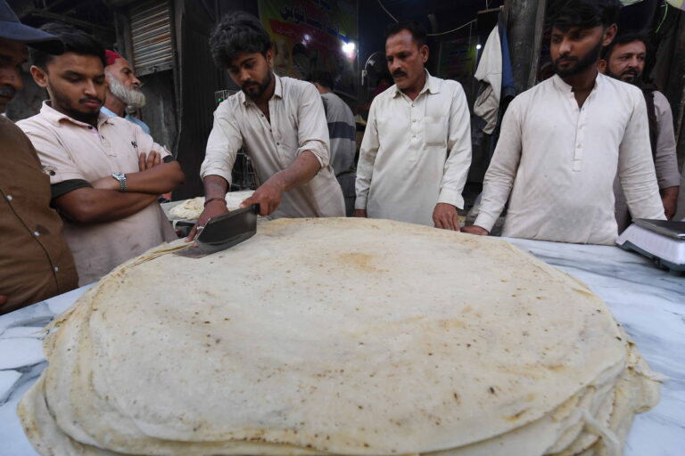 Εργάτες ετοιμάζουν το μεγάλο στρογγυλό ψωμί, που αποτελείται από πολλά στρώματα λεπτής ζύμης, την πρώτη ημέρα του Ραμαζανιού στο Καράτσι του Πακιστάν, στις 18 Φεβρουαρίου 2026. EPA/SHAHZAIB AKBER
