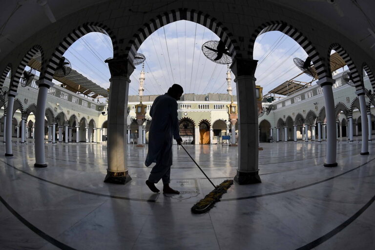 Εργάτης καθαρίζει το τζαμί Khizra, πριν από την έναρξη του Ραμαζανιού στο Καράτσι του Πακιστάν, στις 18 Φεβρουαρίου 2026. EPA/SHAHZAIB AKBER