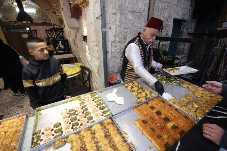 Παλαιστίνιος πωλητής πουλάει παραδοσιακά γλυκά σε μια υπαίθρια αγορά την πρώτη ημέρα του ιερού μήνα του Ραμαζανιού, στην πόλη Νάμπλους της Δυτικής Όχθης, στις 18 Φεβρουαρίου 2026. EPA/ALAA BADARNEH