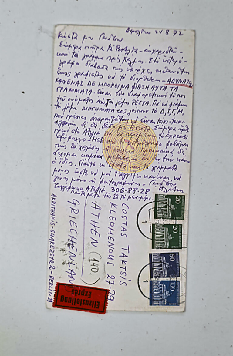 Ακολουθεί αυτούσια η πολύτιμη επιστολή-ντοκουμέντο, την οποία οποία ο Ακριθάκης έστειλε από το Βερολίνο, σε καρτ ποστάλ σχεδιασμένη από τον ίδιο: