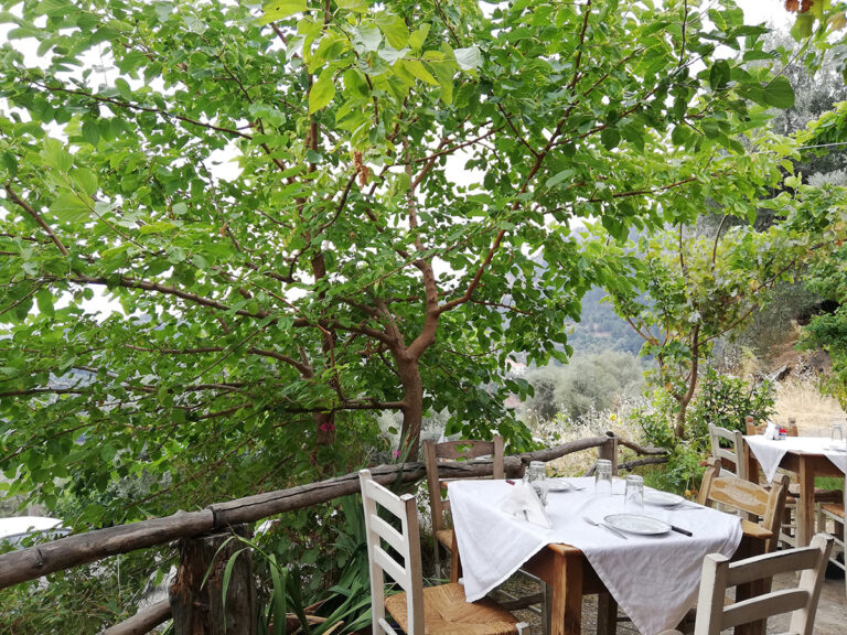 Μέχρι τα μέσα της δεκαετίας του ‘90 δεν υπήρχε καθόλου ηλεκτρικό παρά μόνο λάμπες πετρελαίου και κεριά. Πλέον υπάρχουν φωτοβολταϊκά και μόνο στο εστιατόριο διατηρείται ακόμα η μυσταγωγική συνήθεια του δείπνου υπό το φως των κεριών. Στο τέλος της κατηφόρας του χωριού θα βρείτε το εστιατόριο. Πρόκειται πραγματικά για γαστρονομικό προορισμό. Το μενού ανανεώνεται αλλά μας έχουν μείνει αξέχαστα τα χειροποίητα ραβιόλι, η φέτα σε κρούστα, η φάβα, οι πίτες, η στάκα, τα κρέατα ψημένα σε ξυλόφουρνο που λιώνουν στο στόμα, τα γλυκά… είναι όλα μια αξέχαστη εμπειρία.